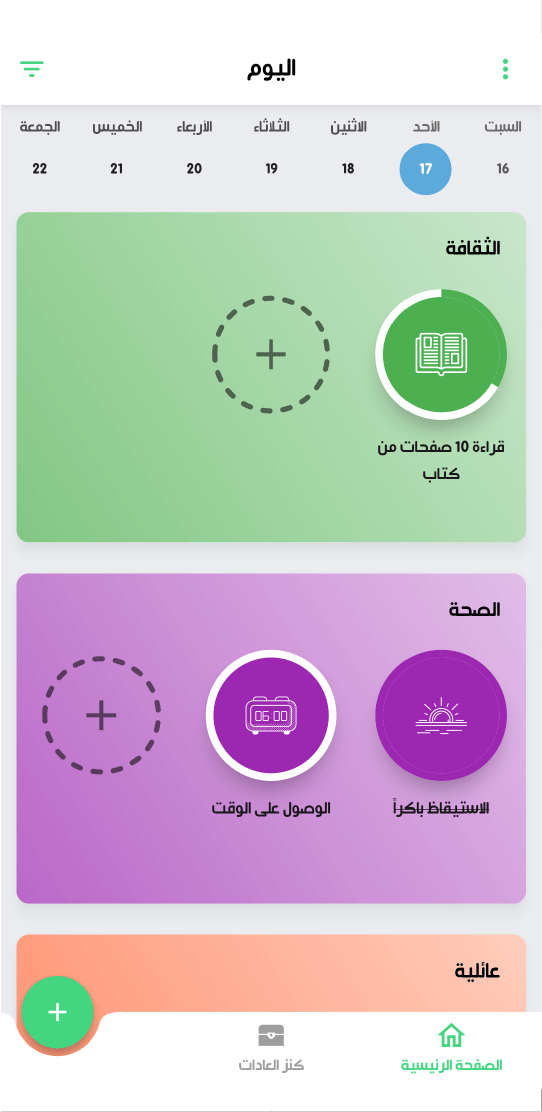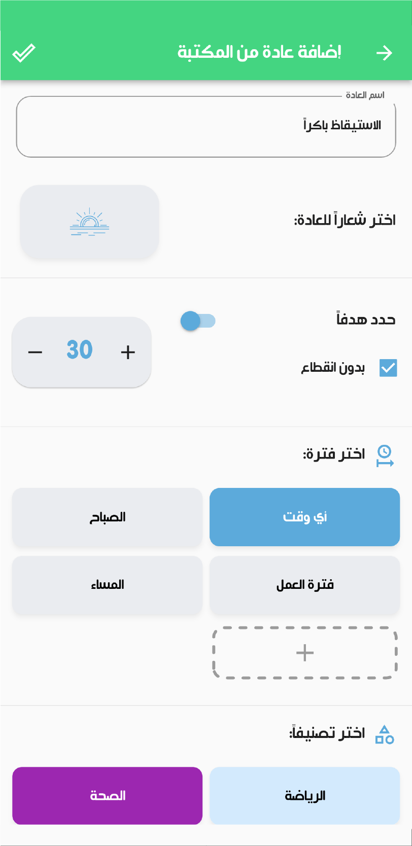 إن إضافة تصنيفات محددة تمثل مناحي الحياة المختلفة وتوزيع العادات عليها يمكنك من متابعة نجاحك بشكل عام في أي منحى من هذه المناحي حتى تستطيع التركيز على الضعيف منها لتطويرها والمحافظة على القوية منها.
